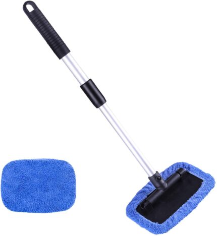 JUSTTOP Windshield Cleaning Tool, Car Window Cleaner with Unbreakable Extendable Long-Reach Handle and Washable Reusable Microfiber Cloth, Car & Home & Office Inside Interior Exterior Use-Blue